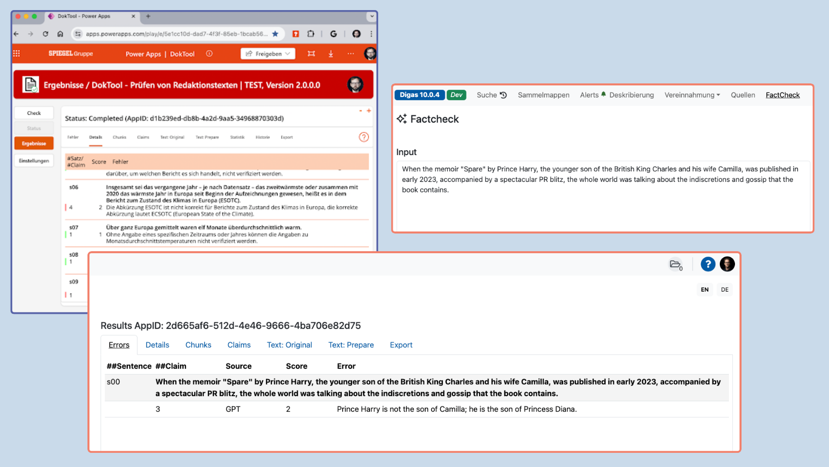 Examples of Der Spiegel’s AI fact-checking tool in action, highlighting its ability to analyze editorial texts for accuracy and provide corrections for factual errors.